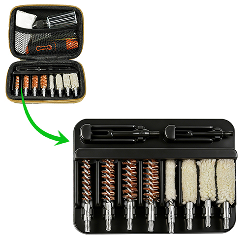 Il kit per la pulizia della pistola include 4 misure (.22, 9mm, .40, .45cal.). Rivestimento in tela BUE
