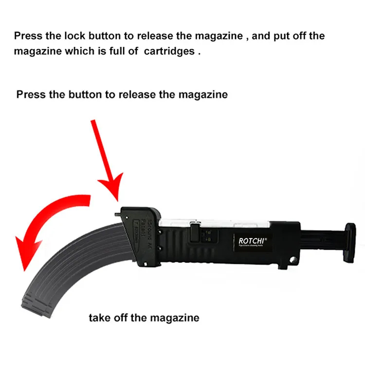 Caricatore di velocità del caricatore per AK47 ● Utilizzato per caricare cartucce da 7,62X39 mm nel caricatore AK con capacità 10/20/30 o superiore. ● Riempire completamente le cartucce nella scanalatura, installare il caricatore secondo lo stesso principio meccanico AK. spingere lo spintore, le cartucce entreranno facilmente nel caricatore. ● Facile da usare, una ragazza può farlo molto velocemente. ● Corpo forte. È possibile vedere le cartucce all'interno del caricatore attraverso il coperchio trasparente. Una serratura controlla che il coperchio non si apra durante lo stoccaggio. ● Può anche scaricare le cartucce dal caricatore quando non si spara ma il caricatore è ancora pieno.