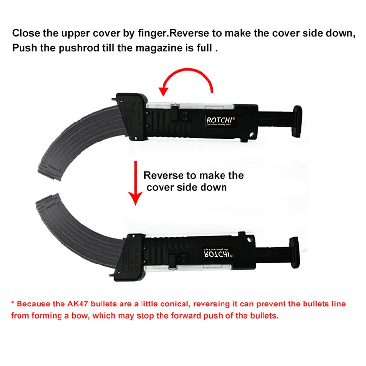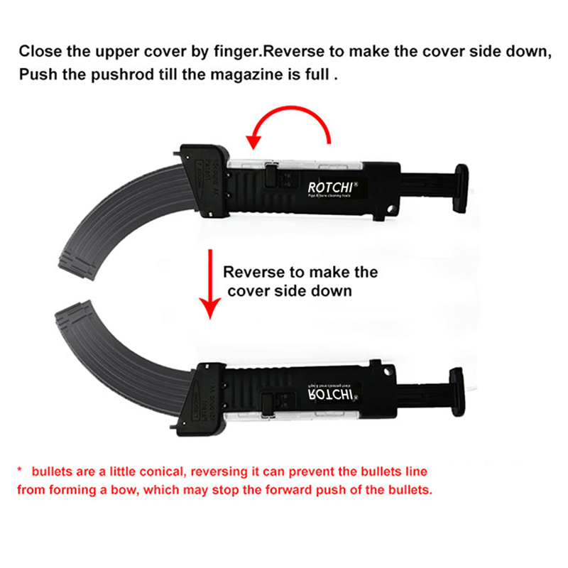 ● Riempire completamente le cartucce nella scanalatura, installare il caricatore secondo lo stesso principio meccanico AK. spingere lo spintore, le cartucce entreranno facilmente nel caricatore.