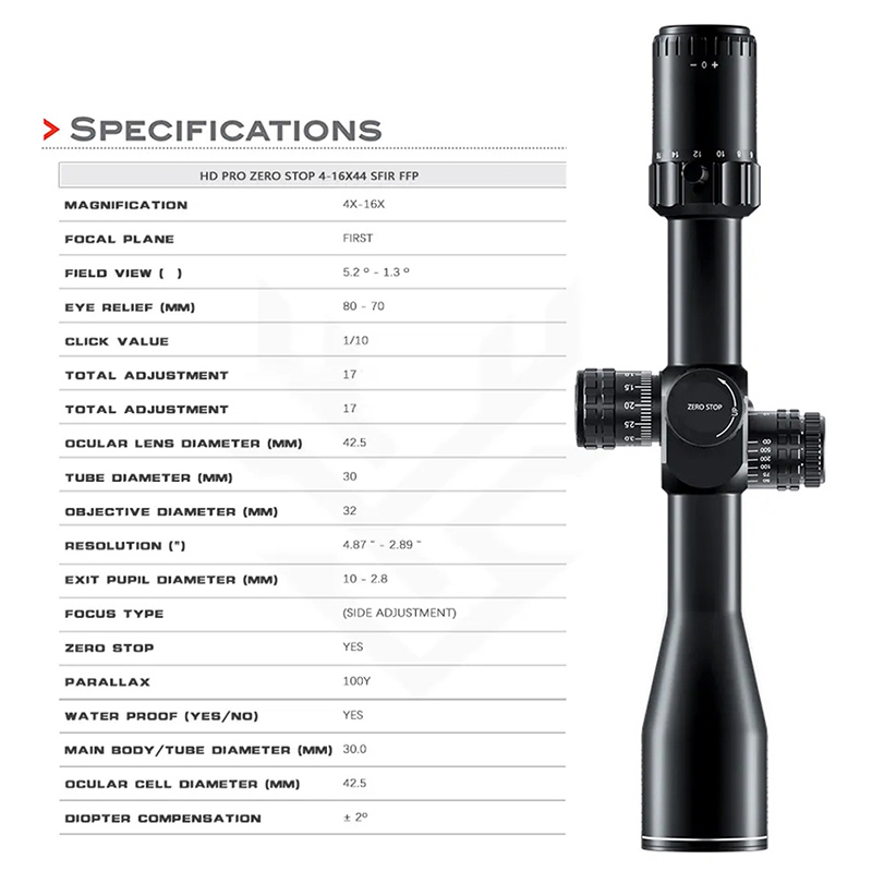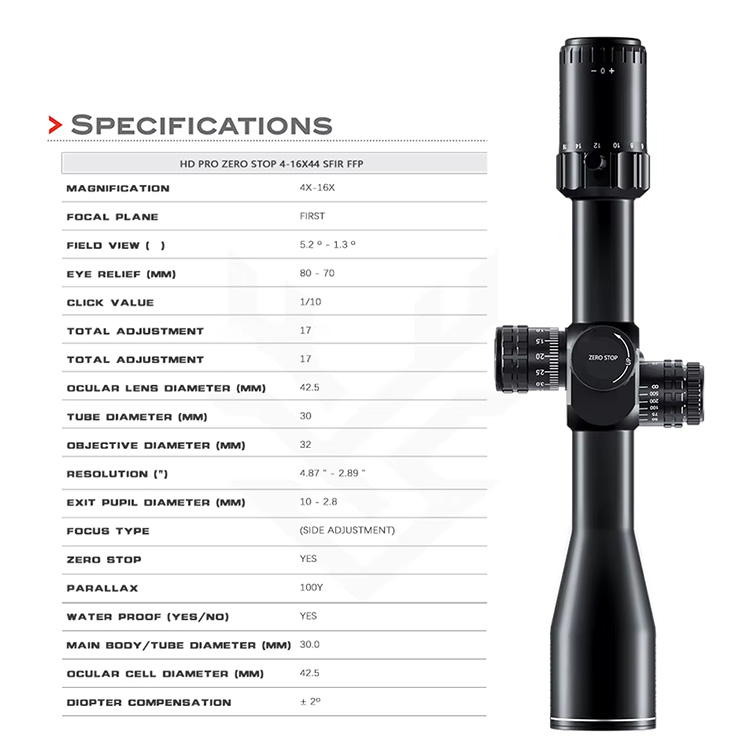 Ottica HD PRO ZERO STOP 4-16x44 SFIR FFP Caccia ad Alta Resistenza agli Urti
