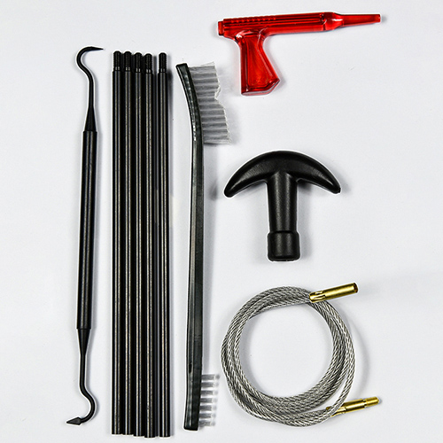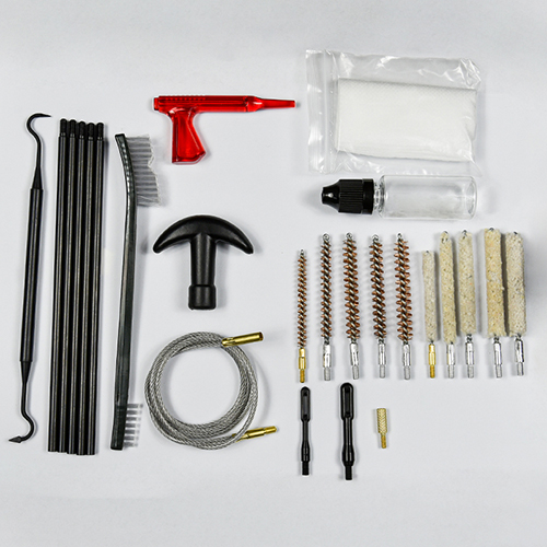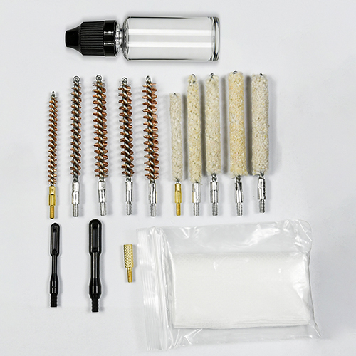 Il kit per la pulizia del fucile comprende 5 misure (.177, .22, .243, .27, .30 cal.), spazzole in ottone e mop in cotone, 5 aste, 2 calbes. Sabbia e colore nero per le scelte.