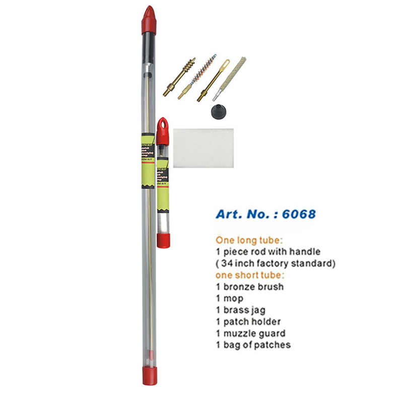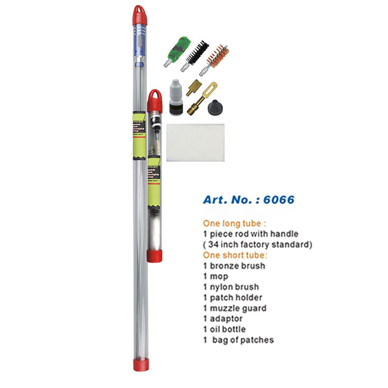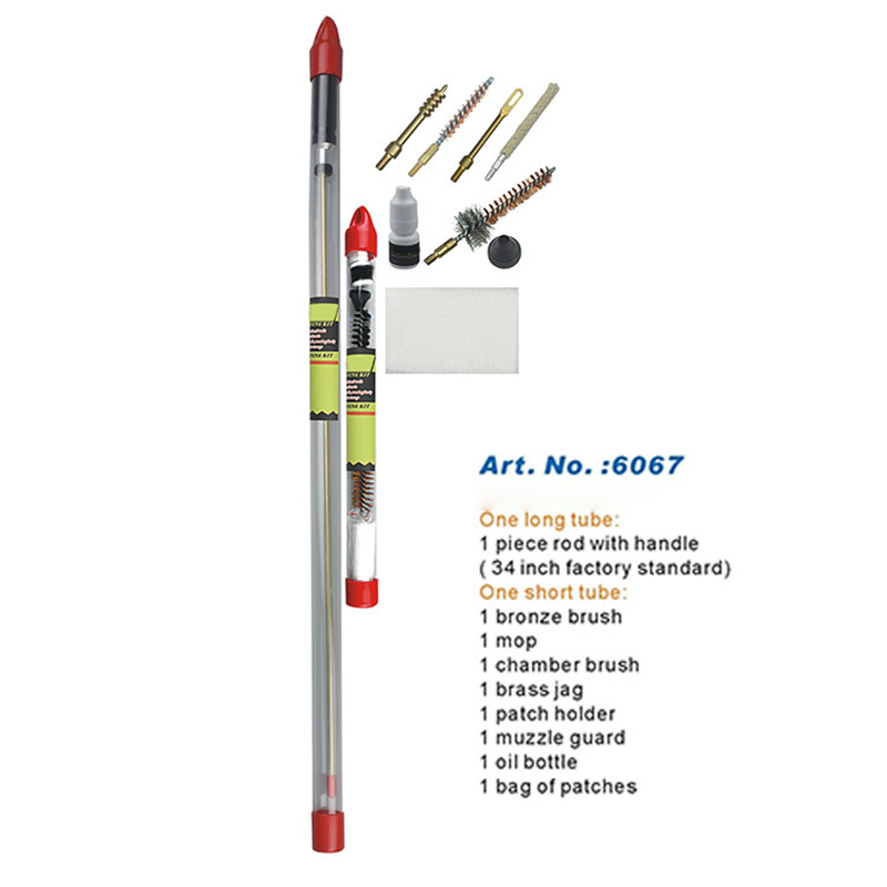 Kit per la pulizia del fucile Confezione con tubo sospeso ad asta lunga in un unico pezzo ● Asta lunga in un unico pezzo da 34 pollici/860 mm, nessun taglio, nessun gradino sull'asta. ● Spazzole e accessori robusti ideali per la pulizia dei fori. ● La maniglia girevole in alluminio scorre liberamente ● Imballato in un lungo tubo trasparente, per trasportarlo e conservarlo facilmente. ● Facile inserimento della chiavetta e del logo OEM o del cliente
